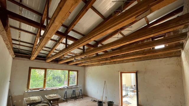 Die Holzbalken der Decke wurden freigelegt, um eine saubere Installationsebene zu schaffen.