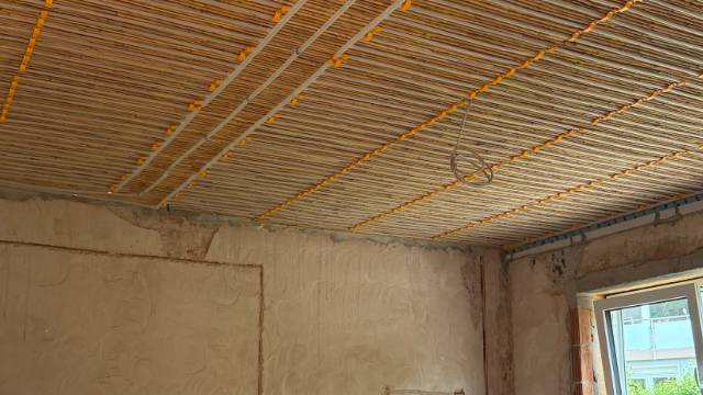Mit OSB-Platten und einem Schilfrohrgewebe wurde eine Unterkonstruktion für die Montage der egger Deckenheizung erstellt. Das Schilf sorgt beim späteren Lehmputz für den notwendigen Halt.